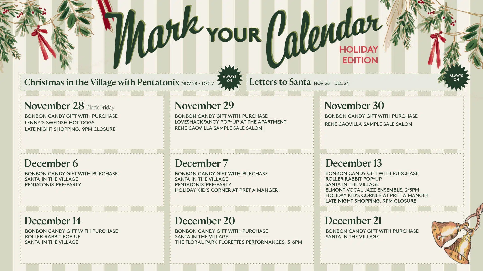 Stroll beneath glowing lights, indulge in BonBon’s cult-favorite Swedish candy, savor seasonal bites from Fiftyfold, and capture a weekend photo with Santa. Explore festive moments around every corner and enjoy special holiday offers that last all season long.